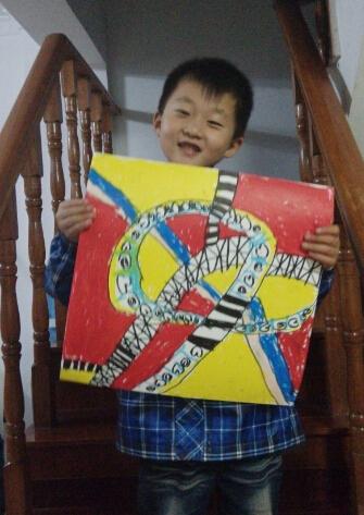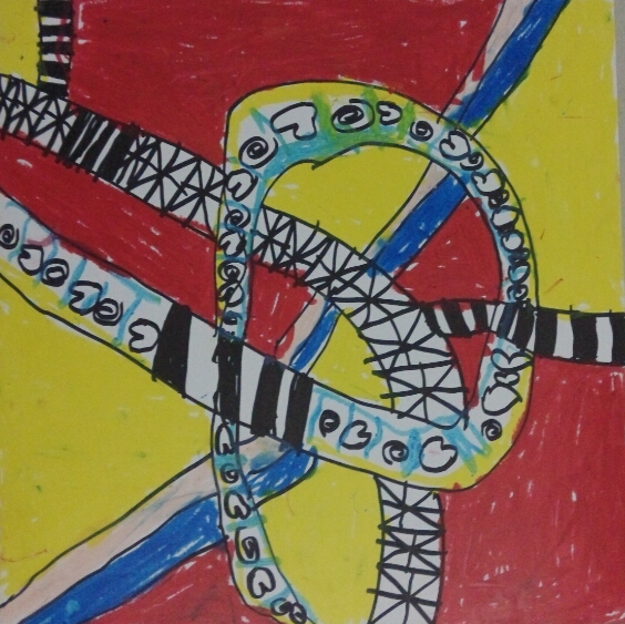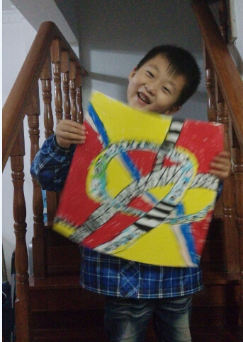 点点的这幅画也是很有意思的,上面是错综复杂的道路,各种线条画出来的道路,交错纵横,下面还有一条蓝色的河流,旁边还是一条小路,这个设想还是真不错的,点点点说当时还没有想到,后来画了一些就想到在立交桥下面可以画河流的,这样的想法很棒,老师也夸点点这个孩子的想象力很不错呢。