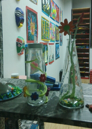 教室四周的环境布置还是很有艺术氛围的,每个绘画教室都是开放式的,都是玻璃墙面,方便家长在外面看到小朋友在教室里的上课情况,另外每个教室后面也有一些学生的作品展示,很漂亮的图画。