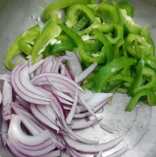 洋葱和青椒切条,然后用平底锅中火加热,把它们煎软,煎去水分,然后盘放凉。对了,还有红萝卜,我忘了拍照了,也是这样子处理的。