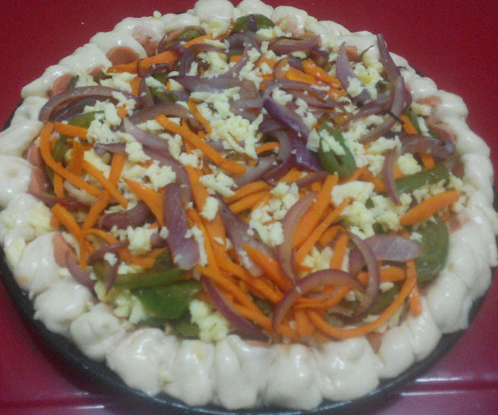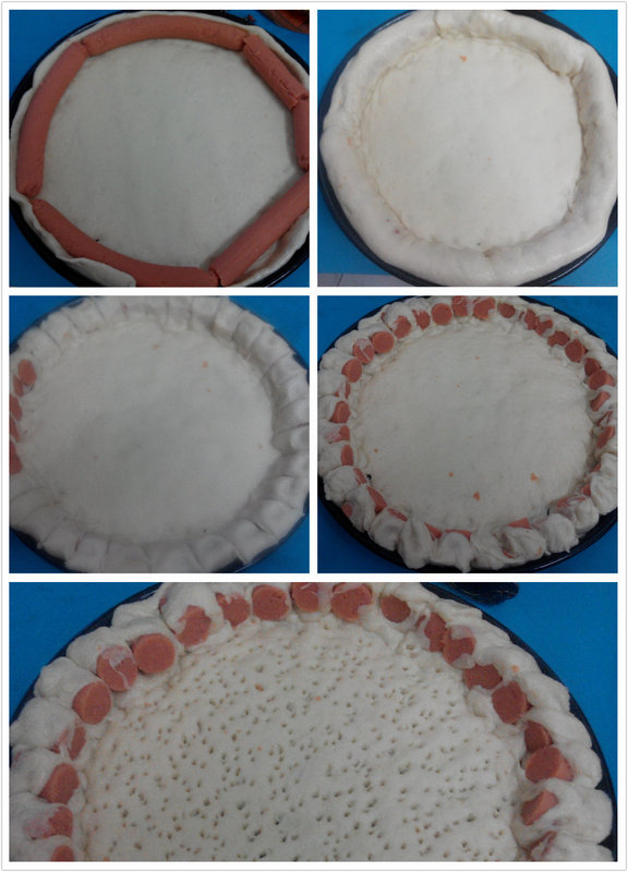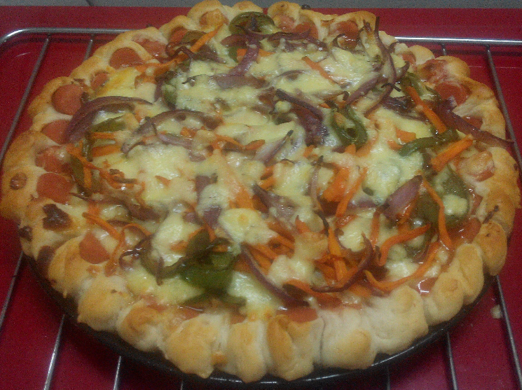 前段时间孩子经常说要吃披萨,幸亏我早有准备,早就买了做披萨的马苏里拉奶酪了,要做随时可以做的。不过,也仅限于此,其他的有些材料备得不是很齐,只有就地取材,家里有什么用什么。于是,这一天下午,我大胆地开始动手了!做法是参照君之的“蘑菇火腿心花边披萨”,但用料方面,我没有蘑菇之类的,就改用洋葱和青椒了。 首先,揉面团,材料(我的模具大概是8寸的): 高筋面粉:120克; 低筋面粉:30克; 水:90克; 干酵母:1/2小勺; 细砂糖:10克; 橄榄油:10克。 将以上材料,用做面包的方法,揉成面团,直到揉到扩展阶段。然后把面团盖上保鲜膜,放在室温发酵,发到两倍大。方子上说是放在28度左右的环境下发酵,正好我们这里的气温是比较高的,所以就放在室温就行。我是揉好面团后,处理一下馅料,然后就去接孩子放学。回来后刚好发酵成功了! 辅料: 火腿肠:5根; 马苏里拉奶酪:150克; 洋葱:半个; 青椒:半个(其实我好像记得是用了一个青椒,所以感觉太多了)。 番茄酱+泰国甜辣酱:适量。 这里要特别说明一下,本来是要加披萨酱的,但我没有披萨酱,而且我不知道什么时候看到过,说加番茄酱和甜辣酱来做披萨,就试着放一些来做。结果,甜辣酱太甜了,失败呀!下次还是再想办法弄弄其他,或者这个量再减少一点了。 洋葱和青椒切条,然后用平底锅中火加热,把它们煎软,煎去水分,然后盘放凉。对了,还有红萝卜,我忘了拍照了,也是这样子处理的。![]() 已经发酵好的面团。看起来是不是很怪?那是我们家的熊孩子,用手在保鲜膜上面搓下去,再抽手回来,就变成这样了!真心难看呀! 取下保鲜膜,揉面团,排出面团中的气体,直到又变回原来的小面团。然后搓成圆形,再静置15分钟。15分钟过后,擀成薄的圆片。我是看着烤盘来擀的,大概就擀成那个大小。然后把烤盘刷上一点油,再把面片放上去。 ![]() 5个火腿肠去皮,靠圆边放,然后用面卷住。再用小刀切边,把火腿肠切成差不多大小的一个,再把火腿肠来个90度的旋转,把“脸”露出来。这里自己摸索一下,切得太小旋转后会太挤,切得太大又不行。不过这个也不难把握,弄一会就会了。然后用叉子在上面搓出很多的小洞洞出来,以方便排气。 ![]() 饼底铺上一层披萨酱,再撒一层马苏里拉奶酪碎,然后铺上一层材料,再撒一层马苏里拉奶酪碎,然后再加一层材料,再撒马苏里拉奶酪碎。不过要留下一点,等烤一会后再撒进去。 1小勺蜜蜂和1小勺水混合均匀成蜂蜜水,用毛刷在饼边上刷上薄薄的一层。然后放入预热好200度的烤箱中层,上下火烤,先烤10分钟,再取出来撒上剩余的马苏里拉奶酪,再烤5分钟即可。 ![]() 我们的披萨出炉了,看起来还可以!只是蔬菜放太多了! ![]() 味道还是很不错的,除了两个缺点:一个就是甜辣酱太甜了,一个就是料太多了,反而阻挡了披萨的美味。不过芝士的味道不错,还有饼很香!有了这次的经验,相信下次的进步空间更大了! 本作品未经作者许可不得转载,转载请征求作者意见。擅自转载使用,将保留追究其法律责任的权利! 个性签名
