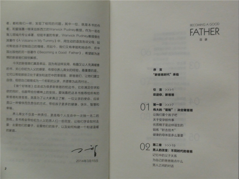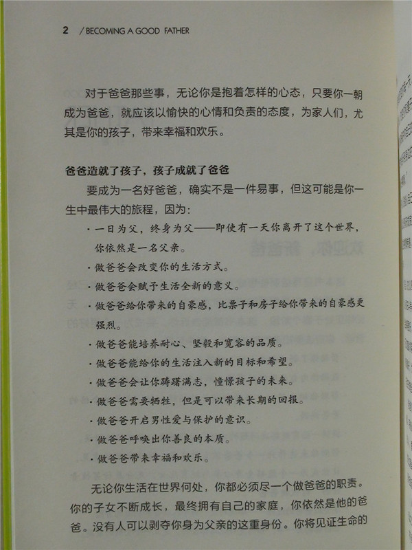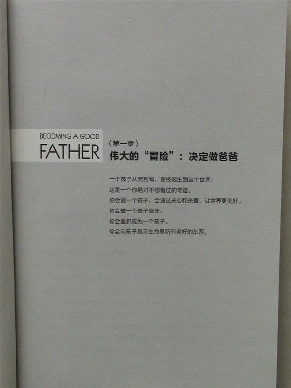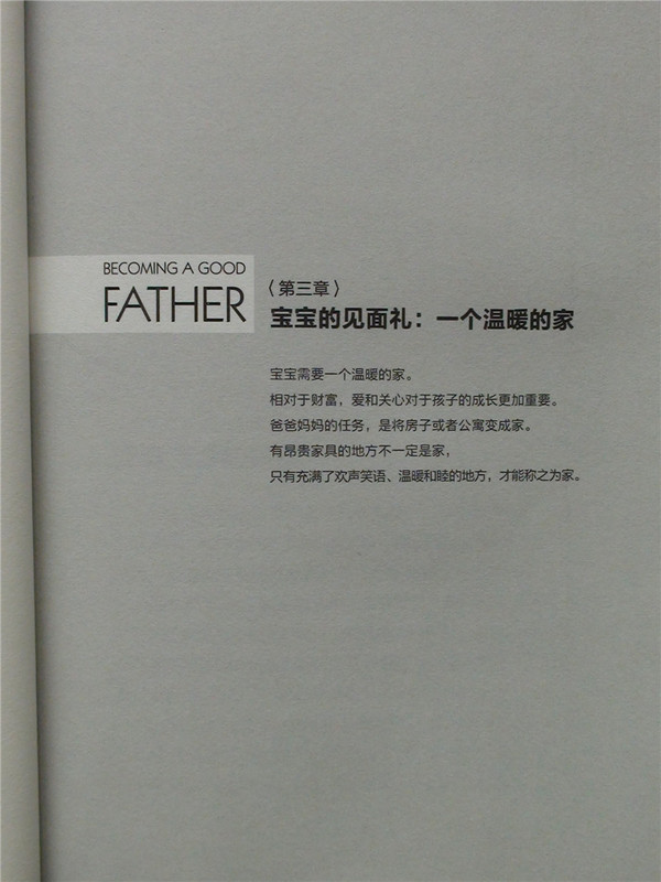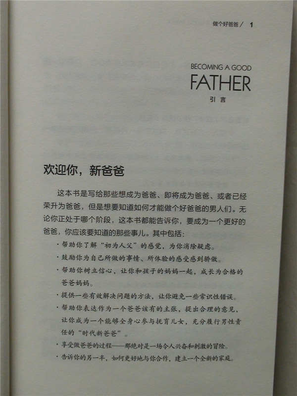 在宝宝地带看到这本书的试读还是国庆节之前,当时看到这本书的介绍,感觉就不错,很想学习一下国外的爸爸是如何准备当爸爸,并如何当好爸爸的。于是立刻申请试读,有幸成功获得这个试读机会,内心真的很高兴,于是就期待书本的到来,上周六中午接到快递的电话,一看是《做个好爸爸》的书到了,手捧这么精美的一本书,感觉真的太美妙了。回到家里打开书一看,果然不出我的意料,这本关于爸爸的书真不一般啊!