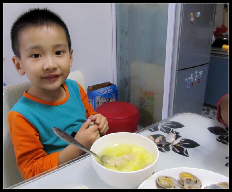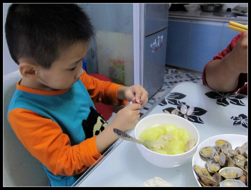 老公边做着边时不时的来客厅跟我显摆,他说今天只买了蛤蜊和黄瓜,土豆是储藏室里老妈早就备好的,而鸡呢,是前几天去超市的时候买的,相当于这顿只花了10元不到哦。我晕,怎么能这么算呢,鸡虽然是前几天可是好歹是花钱买来的好吧。不过比起老公来我还是比较浪费的,因为我喜欢吃新鲜的肉,每顿都得去买新鲜的,菜也是,而且我做的菜一向荤素搭配,而老公做的就是偶尔有有海鲜或者炖汤,总的来说比我强呢。 20分钟后,老公吆喝着吃饭喽,我和Aric赶紧上桌,吃着老公做的晚餐,真爽啊,哈哈。不过我们都不提意见的,因为如果提意见了,老公就会说下回让我做了,我才没那么傻呢,在老公面前,每个菜都是那么的可口美味,所以继续发扬这个厨夫的优势,继续做饭,我看好你哦,哈哈。 ![]() 我家厨夫,奋斗中。 ![]() 黄瓜炒火腿肠 ![]() 爆炒蛤蜊 ![]() 土豆炖鸡 ![]() 喜欢吃蛤蜊的Aric ![]() 还算丰盛的一餐哦,嘻嘻,比我会搭配呢。