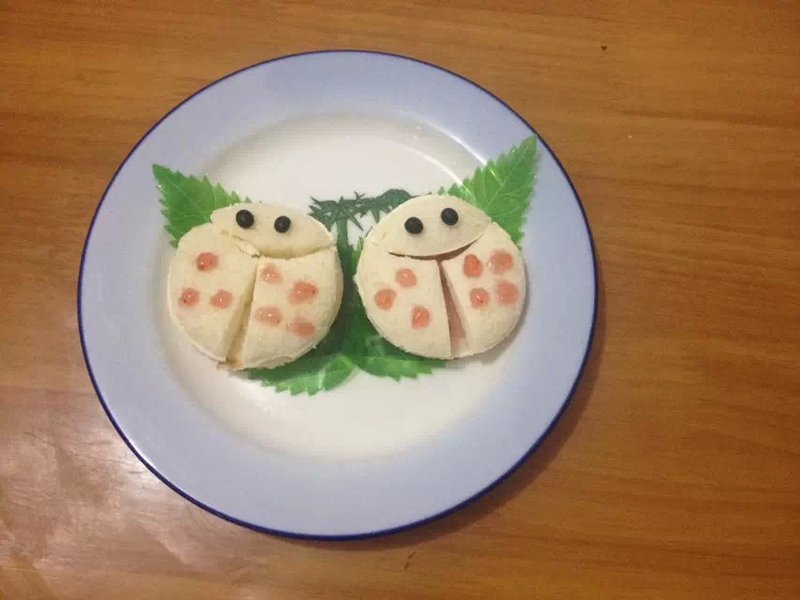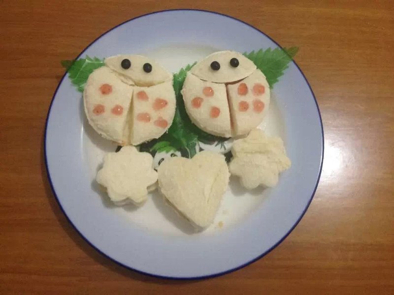 今天早上草草地给她整了一个瓢虫三明治当早餐,完事。 晚上有空闲了,母女俩又开始折腾了。 话说这瓢虫三明治,还是在微信里看到某妈学做的,她还把原创的做法也上传了,我一看到这款三明治,好萌好可爱,小朋友一定喜欢,而且做法简单,赶紧收藏起来,备用。 ![]() 我是属于有学习热情,没坚持动力的人,所以一般只限于“尝鲜”,不过这做法确实好简单,有空可以经常做呢!当妈妈的想让孩子自觉吃饭,爱上吃饭,但往往事与愿违,孩子对吃饭就是很抗拒。孩子不爱吃饭,不肯乖乖吃饭最头疼了。 或许,偶尔我们也要花点小心思,给宝贝一个惊喜,相信这款三明治孩子们会喜欢的,至少我家小妞第一次看见,就说好漂亮啊!抓住了她们的眼球,自然就会喜欢上了。 ![]() 萌不萌? 材料:白吐司、草莓酱(有蓝莓酱可以做成不同口味的)、黑豆(当瓢虫的眼睛) 做法: 1、取一片吐司,用圆形模具压出形状。PS:我没有圆形模具,用的一个塑料杯子杯沿压出来的 ![]() 2、同样的方式,压出两片圆形吐司 ![]() 3、取其中一片,用模具或杯沿划出约三分之一的吐司片,其余的一分为二 ![]() 4、用黑豆装饰为眼睛(或者蓝莓果酱点一下也可以,我家只有草莓果酱),我用牙签挑了7个点,这样才更像七星瓢虫的是不? 下面的心形,花形三明治是用饼干模具压出来的,把那些边角材料也用上了。发现我买饼干模具一次也没做饼干,全派上其他用场了。 ![]() 向原创者致敬!这是一位怎么样有爱的麻麻才能有这么好的创意啊!学习了! 本作品未经作者许可不得转载,转载请征求作者意见。擅自转载使用,将保留追究其法律责任的权利! 个性签名
