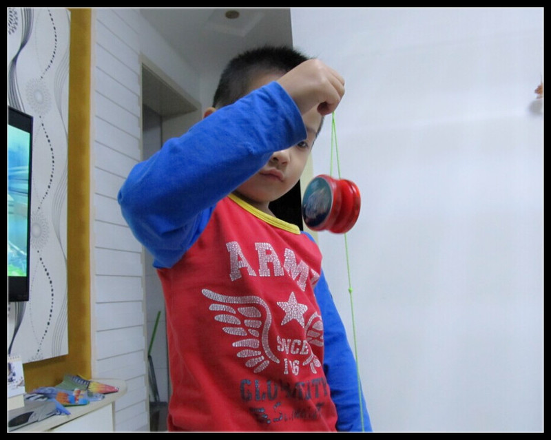 小孩子的兴趣就像三九天,一会一个变化啊,这不,Aric最近又迷上了悠悠球。只能说万恶的动画片啊,这完全是在荼害孩子的专一嘛。还记得上一次的兴趣是陀螺,那买了不知有多少个了,而这次的悠悠球我很明确的告诉Aric,如果想玩,那么就只能买一个,多了老妈我不伺候。Aric一个劲的保证就一个,然后去买的时候再次挑的眼花缭乱,不过这次倒是很自觉,就买了一个,而且还不是很贵的那种。 自从有了那个悠悠球以后,Aric就表现出极大的兴趣,可是他不会玩啊,就问我会吗?我很骄傲的告诉他,肯定会啊,这多简单啊,我小时候可是打遍天下无敌手的。Aric说可惜你小时候我没见过。然后我在给他表演的时候,Aric全程冒着星星眼。老公在旁傻笑,趁着Aric去个厕所的功夫跟我聊,也就我忽悠儿子,其实我只是把悠悠球放下来,然后自动转回来,或者转上几个圈而已,这多简单啊,哈哈。