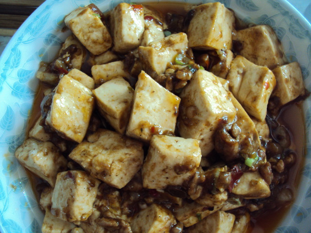 附上麻婆豆腐的做法:把豆腐切成正方形,放开水里焯一会儿,这个开水要放少许盐,这样焯一下会使豆腐的口感更鲜嫩,炒起来也不容易碎;锅中油热到六七成后,放入提前切好的肉末,翻炒炒散,然后再放入红油豆瓣酱,炒一会儿再放入葱花和豆鼓爆炒,放入适量热水,下入焯好的豆腐,煮三到四分钟,水多了的话要大火收汁,然后撒入勾芡出锅。
