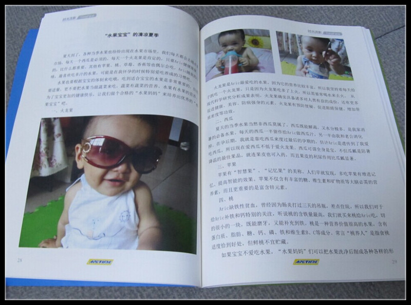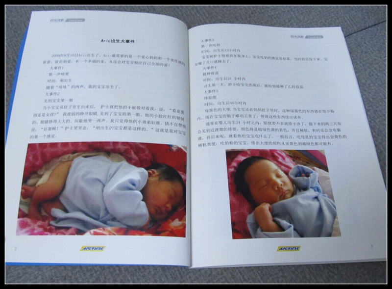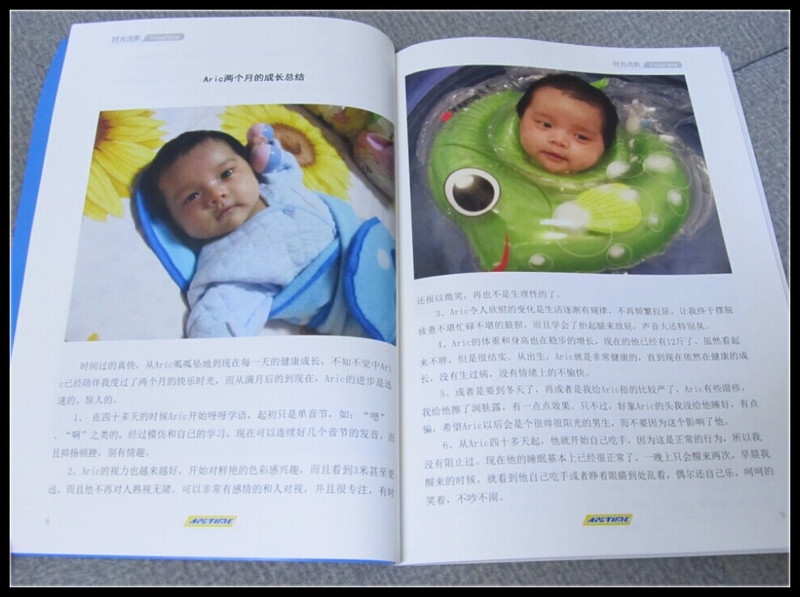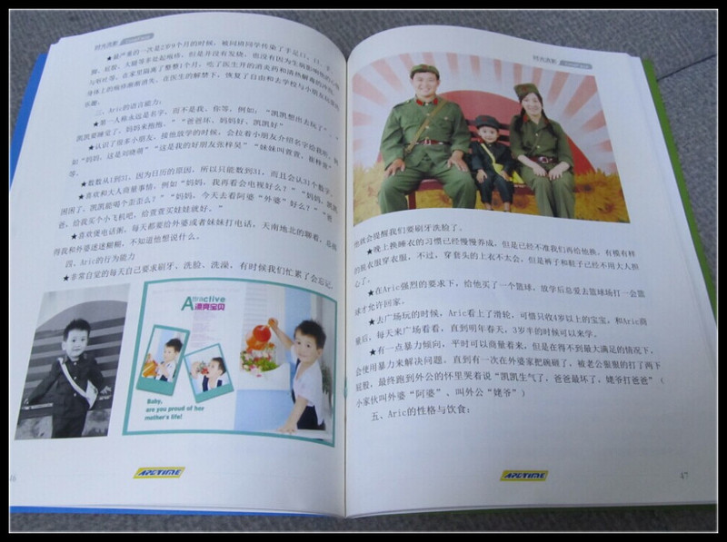 我很庆幸一直给Aric有记录,在做这本书的时候,顺便回顾了Aric从出生起的成长过程。五年过去了,时间过得真快啊,而Aric从嗷嗷待哺的婴儿成长为现在的一个小帅哥,这个过程有心酸也有快乐。翻找那些婴儿时的照片,看到小家伙的小模样,心里倍儿甜蜜,而Aric在我制作的过程时不时来打扰,最后给了我一个总结,就是妈妈只有我一个孩子,多好啊!哈哈,不过老公可是特别期待的呢。 终于收到了书,老公就先翻看了一遍,他太惊讶于我的记录了,说做我儿子多幸福啊,而Aric在旁笑眯眯的看,偶尔指着书中的照片感叹,这个小朋友怎么那么帅呢?其实有很多照顾小宝的事情我现在都不记得了,可是有了这本书,哪怕我再有一个小宝,也还是可以想起怎么做才能做得最好。很漂亮的书,再次感谢大家对我的帮助。且看我自己写、自己做的Aric的幸福时光吧。 ![]() Aric出生大事件,记录了Aric共九件大事件。 ![]() Aric两个月的成长总结,喜欢发声音、喜欢模仿、喜欢游泳。 ![]() 水果宝宝的清凉夏季,也是Aric出生起的第一个夏天,那时的Aric已经半岁了。 ![]() 我的宝贝一岁了,会撒娇、会委屈、爱调皮捣蛋、喜欢无恶不作,可是他却是我们最爱的宝贝。 ![]() 当天使已经慢慢长大,宝贝已经三岁了,图片是Aric2岁半时我们一家人一起去拍的,还记得朋友指着我们的合照评判为:伪军、国民党、共产党。 ![]() Aric的第一次新年手工贺卡的制作,也是我们第一次突破自己的弱项,很有纪念意义呢。 ![]() 快乐的暑期青岛自驾三日游,Aric第一次见到大海,第一次去极地海洋世界,看到了那么多美丽的海洋动物。 ![]() 其中还有很多Aric的成长记录就不详细晒了,我想以后每一年都做一本,也是非常美好的回忆。我会一直把Aric的成长记录下来,等有一天拿给我的孙子、孙女看,想想就觉得好幸福哦。