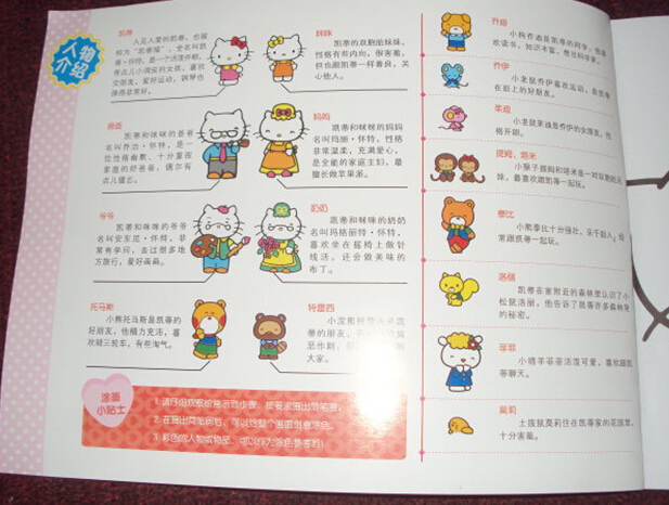 翻开书的第一页,在封面上就有关于凯蒂猫的人物介绍的,看介绍就知道了凯蒂一家的情况还有凯蒂的小伙伴们的情况哦。儿子很认真地看介绍,还让我一个一个讲给他听呢。他说他最喜欢的还是Hello  Kitty哦。我也很喜欢凯蒂猫的形象,多可爱多温馨的样子呀!