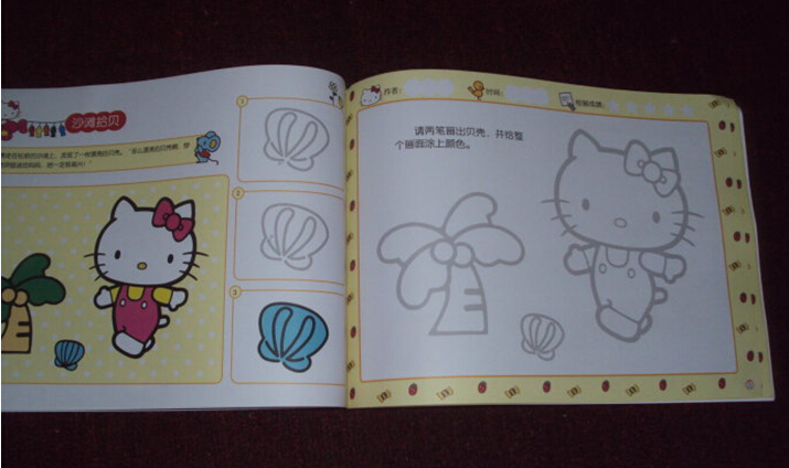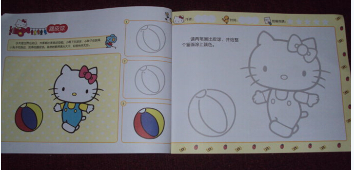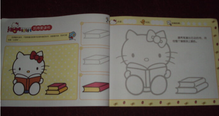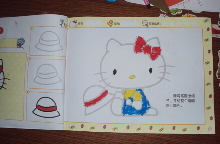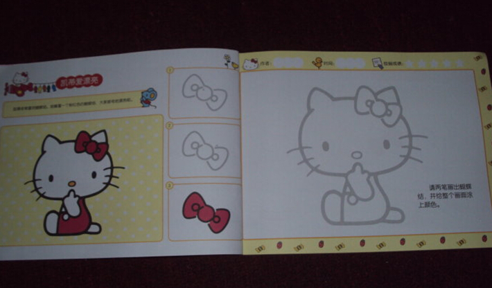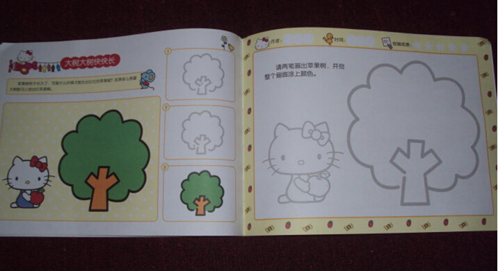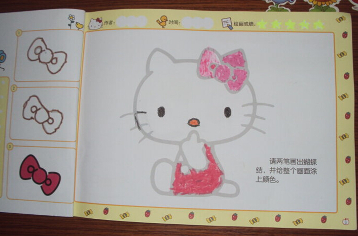 接下来给大家介绍一下书中关于简笔画学习的编排吧。这本书很贴心地按照孩子们身心发展的特点,采用难易递进的方法来介绍二笔画的画画过程,二笔画的意思就是只要两笔就可以画出一样东西来了,比如书中凯蒂猫的蝴蝶结还有帽子等等。同时书中采用梯级分类的方法,循序渐进给孩子的画画打下基础,还有涂色的训练,让孩子可以熟练掌握绘画技巧,提升孩子的想象力哦!