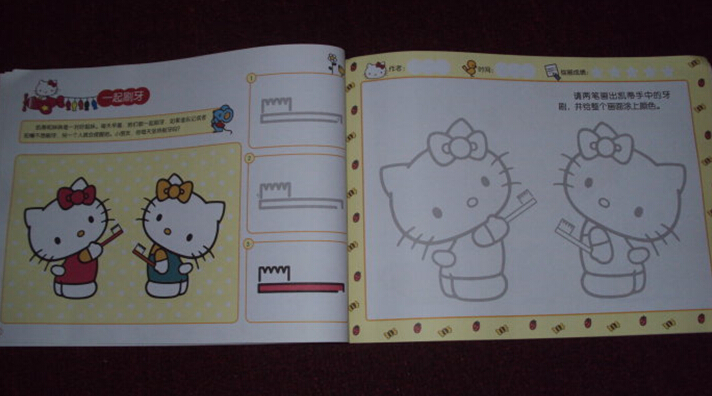 现在,来给大家展示一下我家小子最新的两幅作品吧,他说他自己可以把一本书都画完呢。我说不着急,慢慢画,每一天都画两幅就好了,这样我们每一天都可以画画了,这样多好啊!儿子还说要和亲戚家的姐姐一起画呢,姐姐肯定也非常喜欢凯蒂猫的哦!