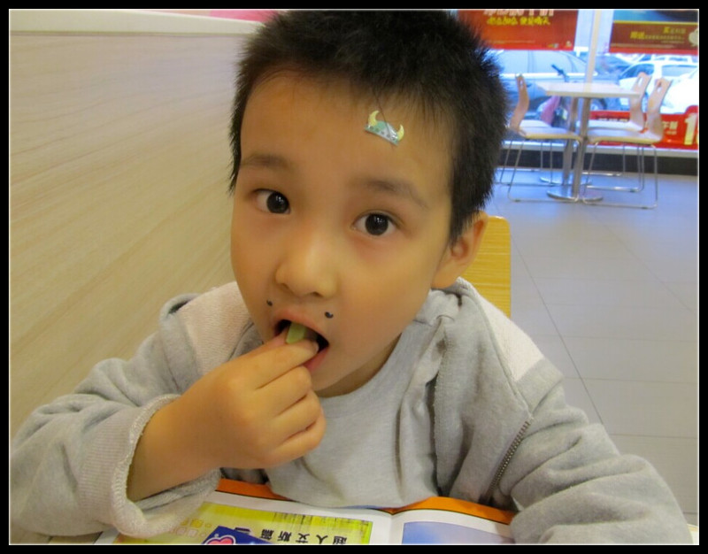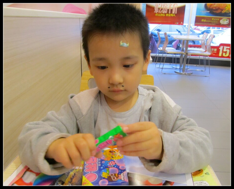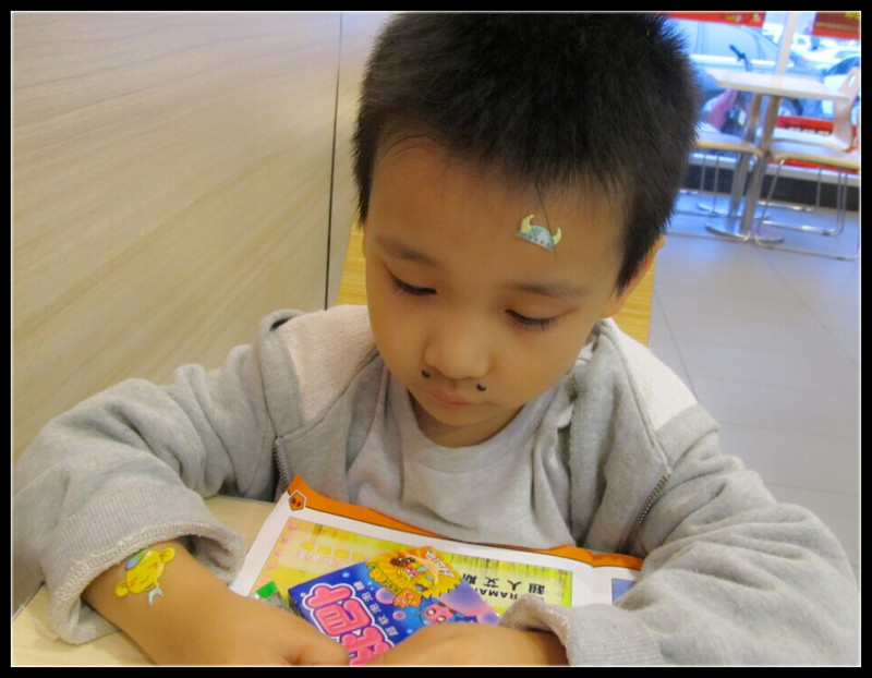 老公突然被一个电话叫走,我和Aric闲着无聊给老公打电话问他在哪里,得知他在肯德基的广场店,我和Aric就乐颠颠的出发找爸爸去。在等待的过程中有些无聊,Aric买了一大包泡泡糖在大厅和我分赃,其中有送的几个贴纸,Aric极其喜欢。很有趣的小贴纸,都是立体的,而且是给里面的一些人物来贴上胡子、帽子等,但是Aric可舍不得随便贴,就让我按照他的脸型,贴在他的脸上。 我看到有小胡子,就贴到了Aric的嘴唇上方,虽然小小的,但是却还真有那种长胡子的样子呢,还有牛角的帽子,可惜太小没地方贴啊,Aric指了指额头,“妈妈、贴在这里。”好吧,我给他贴到了额头上,嘿,太可爱了。不过其余的贴纸可怎么利用呢?Aric也想不出来,如果贴在脸上就有些不伦不类了,那怎么办好呢?过了一小会Aric伸出胳膊来,“妈妈,贴到我的胳膊上吧,不浪费嘛!”