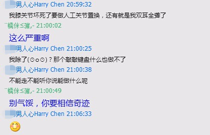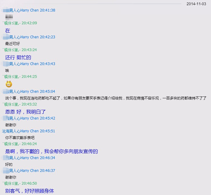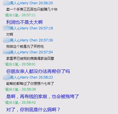 今天再次收到了一个网友的消息,其实我都有点怕他了,我们并没有见过面,我快不记得我俩怎么认识的了,好像是曾经参加过一个活动,然后需要投票,就经过朋友介绍认识了他,他帮我投了票,后来加了好友,也没什么交集,偶尔在QQ上说说话,具体他的情况我都不知道。可是从去年起,他就经常像叫魂似得叫我的名字,因为参加的那个活动需要真实姓名,所以他也就这样知道了。我很奇怪他总叫我干嘛,然而从那以后,我就这样被记住了。 原来他生病了,已经好多年了,今天问他什么病,他的回答是:我膝关节坏死了要做人工关节置换,还有就是我双耳全聋了。其实到最后我也不明白他到底是什么病,只知道他已经病了6年了,家里因为他的病,已经入不敷出,朋友借了很多钱给他,而满足不了他病情的需要。所以他现在开网店来卖表,希望增加点营业额,可以让他继续治病。他说他现在连100多块钱的药都买不起了,实在是没有办法了,只好找人来宣传买东西。