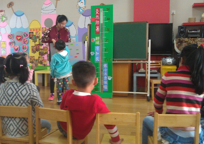 小小科学课学的内容就是温度计的认识,今天老师先出示了一些刻度,然后问小朋友们那些地方需要刻度的,点点回答说直尺上有刻度的,还有我们的饮水杯,奶瓶等等。然后老师就告诉小朋友这个度怎么表示,然后认识了零度,接着让小朋友们找到几度几度,每一个长线就是十度,短线就是五度,接着老师就讲了二十八度到三十八度就是高温天气,需要防暑降温。二十度到二十八度是舒适的天气,零下几度就是寒冷的天气,冬天了。这样老师让小朋友们自己找一找自己手里拿到的温度,然后贴在温度计上面,有一些小朋友贴错了,点点倒是全都贴对的,然后老师总结规律了。
