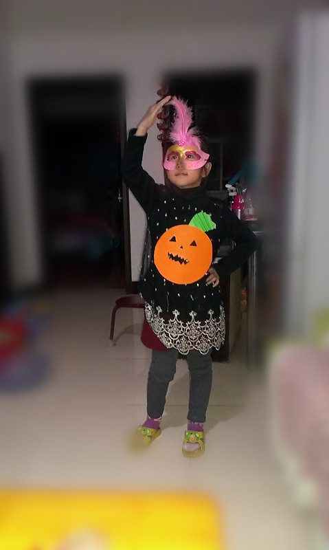 最后一个环节要把南瓜头粘贴到衣服上有点伤神的,开始用的双面胶,但是很快有些地方就掉了的,后来用的订书机订上去的,还算是牢固的。(可惜做的过程忘记拍照了) 这样一个万圣节衣服就做好了,加上俺家以前买的面具,就算完成了。虽然做的不算最好,但是和孩子一起完成这个作品,还是很开心的。