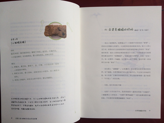 细细的翻读着《巫婆上菜》发现,它不是故事书,也不是绘本书,更像是科普书,普及我们不常见的一种喂养动物的方式,或是重新的认识动物。那么先从巫婆开始,也就是本书的作者,巫婆是她的笔名,或是她的外号。作者很喜欢这个名字,这个名字可能让我们觉得她一定是一个老太太或是脏兮兮怪怪的女人。其实不然,她是一个动物爱好者,更是一个动物科学家。给自己起这样一个名字,就是因为对动物的另类观察。来自于发现动物的习性,动物的喂养。读着这本书,感觉非常的轻松,就像是一个非常好的休闲读物。对于想给孩子讲故事的我来说,是一个很独特的故事读物。带给我全新的认识动物,认识与我们息息相关的动物。 书中内容更是读起来轻松,愉悦。书中描述了穿山甲也会流鼻涕,大象玩轮胎,或者是擅长在树上生活的长臂猿也会摔倒在地上。读着读着不经莞尔一笑。刺猬的跑步机,小兽体验保定板,雌像马兰的药球等内容真是好玩又有趣,这些是我们平常不知道,也从未听说过的。原来生活在动物园的动物们,生活竟然这样丰富,而不仅仅在于我们去参观它们。也让我们知道,动物园的为了让动物活得更精彩,更像是在野外,付出了这么多的努力,这么多的辛苦。 更加让我和孩子兴奋的是,动物食谱,竟然人也能吃。每个好玩的食谱前面都有一段有趣的动物故事。这些故事本身丰富到可以独立成为一本书了。而食谱也有足够的趣味性让大人,小孩想去尝试,加上充满童趣的插画把食物和故事搞在一起,果真好像出现了魔法的气氛,就真的像巫师出现了一样。每一个食谱都有一个怪异的名字,人版猴米糕,圣甲虫太阳巧克力,迷你轮胎甜甜圈,恶作剧骑士蛋糕....一系列奇怪的名字,让人觉得好笑,又想动手实践。读后发现每一个奇怪的名字做出来的食物,都是那么的好吃,有些还是我们日常经常做的。就像蛋糕,我经常做给孩子吃,就从来没有想过弄一个很响当当的名字,唤起孩子的童年色彩。 最后在书中,不仅提到动物的友好善良的一面,跟多的是让人们知道,动物也是有生命的,与我们一同生活在地球上。和我们共存亡。那么就像书中的失调的动物,喜欢吃人类食物的猴子,这都是人类不善的行为照成的,并且提议人类要爱护动物,保护动物,与动物和谐共存。 这些天偶尔开始读给孩子听,孩子很喜欢,希望带给孩子以知识和力量,更多的了解动物可爱的一面,更多的了解动物知识,学会观察动物,爱护动物,保护动物。让孩子有一颗慈善的心。 书中精彩内页展示! ![]() ![]() ![]() ![]() ![]()