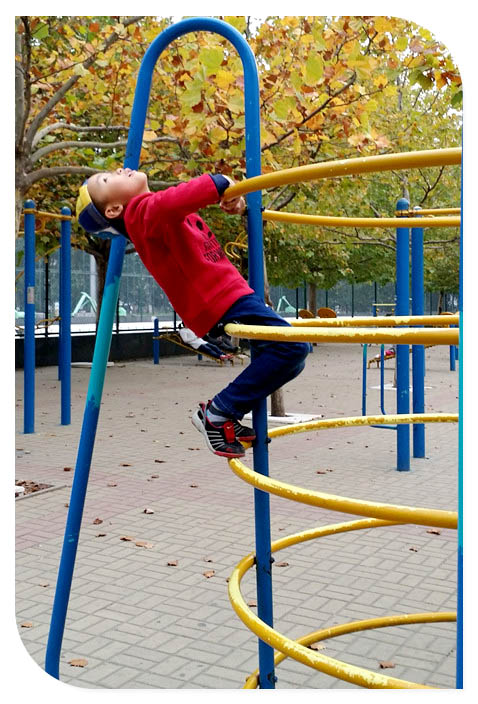 接下来小家伙又投入到了玩这个爬高的器械当中。爬到自己喜欢的高度后,故意的头往后仰,站在下面的妈妈只好叮嘱着小家伙一定要小心啊,手要抓的牢牢的。有的时候喜欢孩子玩器械,因为很锻炼宝贝身体的。可是有的时候还希望宝贝少玩器械,因为看着娃玩器械的时候会更累些。