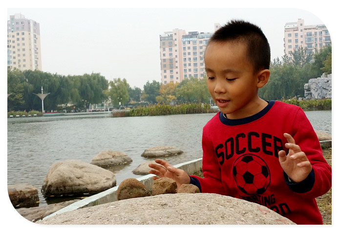 终于离开器械区域了,小家伙要玩水了。找了根棍子站在石头上玩水,甩棍子激起水花,让孩子开心不已。看到宝贝因为玩水溅起来的水花已经湿了衣服的时候,妈妈想了个办法吸引小家伙的目光,就是找了几块大石头来敲声音,听听看是不是石头的声音都是一样的,小家伙来了兴趣也尝试了起来。