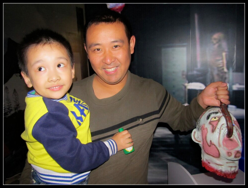 Aric刚开始看有些不明白,直到爸爸告诉他,这是因为护士阿姨吃掉了小婴儿,所以才是这个样子的。只听“啊!”一声,Aric趴进了爸爸的怀里喊着“赶紧走、赶紧走,太吓人了!”不过这护士的桌子上还有不少头呢,老公抓着拿起来吓唬Aric,Aric干脆把头转过去看别的地方。我刚开始也是有点害怕的,但是老公说这是软胶做的,我就去摸了摸,嘿,果然是软胶做的,就那骷颅头也是特别轻的塑料做的。 不过还没看完呢,Aric就跑了出去,时不时的站在门口往里面看,喊着“爸爸快出来啊!”而此时的老公在做什么呢?原来我很认真的拍照,没注意过身边,老公拍了拍我让我抬头看,只看我的脑袋上面,一只断手吊在上面,呜呜,吓死我了,心跳加速啊,赶紧跑了出去陪儿子,这种鬼屋还是不要进去的好,估计今晚会做恶梦了。一会老公才出来,还有些意犹未尽,说一点儿也不吓人。我和Aric瞪了他一眼,这人绝对故意的,哼。 ![]() 刚开始没开闪光灯,好黑啊。 ![]() 照片太多了,干脆就选了几张,不单独放了,合在一起吧,省的吓到人,哈哈。 ![]() 老公在研究那些可怕的头颅,Aric有些害怕,直到老公拿过来给他看。 ![]() “我不看我不看,我就不看!”虽然是软胶塑料做的,但是还是蛮逼真,很可怕啊。