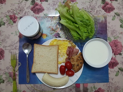 首先是主食。小朋友吃一片面包片打底就可以了,有时候吃馒头、花式面包、蛋糕,可以迅速补充能量,好消化。面包片抹上芝麻酱,不但口感上增加了甜度,更受孩子欢迎,而且芝麻酱有补钙的作用。 然后是蛋类。鸡蛋换着花样做,煎鸡蛋、煮鸡蛋、蒸鸡蛋,让孩子有新鲜感,增加食欲。另外还有一片煎培根,因为我家小朋友是不折不扣的“肉食系”。 接下来奶类。牛奶或豆浆都可以补充蛋白质,随心搭配就好。夏天的早上我更偏爱酸奶,尤其是把水果放进酸奶一起吃,很美味。 最后是新鲜的蔬菜和水果。这次配的是小西红柿、生菜、香蕉。可以根据当季的情况,搭配不同的材料,比如蓝莓、橙子、黄瓜……但是请注意,除了苹果,其他很多水果不适合空腹吃。我们一定要留到最后享用水果啊。