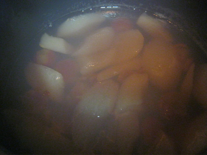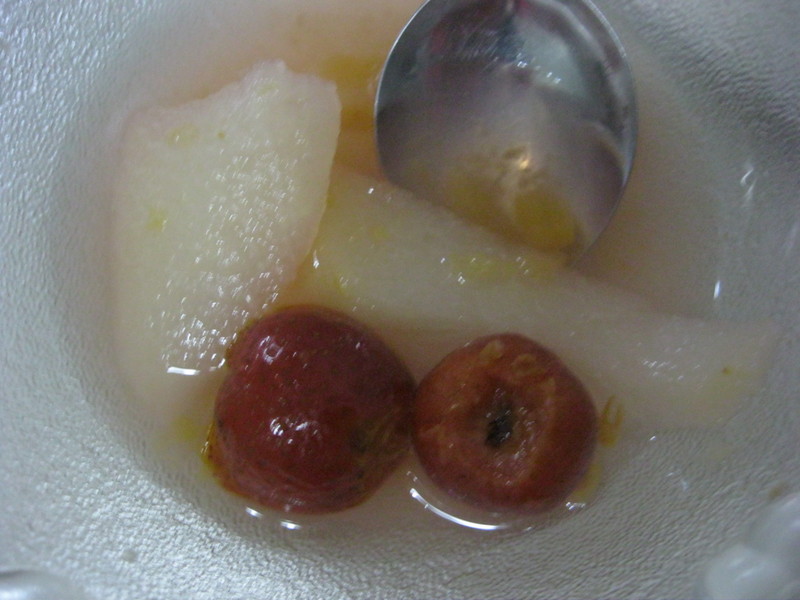 当然我们还有一个好东西,那就是自制罐头,绝对的纯天然哦,一点防腐剂都不加的。做法也是非常的简单,把梨削皮,切成小块;山楂洗净去掉蒂,锅里放水加冰糖,最好是冰糖啊,非常的好吃,就像买的罐头一样一样的。非常的利于消化,而且梨也是润喉的好食品,有止咳的疗效,是秋冬的好零食!