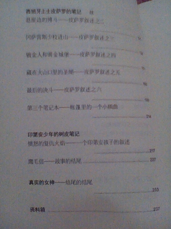 故事以四本笔记展开,引领读者经历了一次古老文明的发现之旅,一场勇气、智慧与贪婪的对决,穿越深不测的历史迷雾,看尽绵延万里的山岭,走进传说中最神奇、不可抵达的“黄金国“圣地。故事情节曲折,扣人心弦,文字描述简洁准确,让人有一读之下,不忍释卷的感觉。这本书更适合从头到尾的阅读,更能够清楚故事的来龙去脉。我开始随手翻到一节,读着其中的描写,感觉道德取向有点不对,读到后来,才发现这是一个强盗写的笔记,啊,原来如此!因此,在引导孩子读这本书的时候,一定要让他们从头至尾的读完。 书很快就读完了,我又翻到精彩的地方温习了几遍,个人感觉,这是一本非常适合少年孩子们读的书籍,故事情节和描写都有独到之处,因为作者从科学的角度出发,以故事的形式引领孩子们走近科学,书本后的附的相关知识介绍也很吸引孩子,喜欢科普知识的孩子经常会就一些他们不懂的词汇发问,而书后的知识介绍就解决了他们的问题,从这点可以看出,作者是很懂孩子们的心理的。我不知道别的孩子是怎样开始读这本书的,咱家那个小男孩就是先读了后面的资料箱,再读的故事。 《祖母绿女神》是我认真读过的第一本探险小说,以前我和孩子也读过一些探险类小说,因为对这类书籍不感兴趣,所以,一般是孩子读,我都是随手翻翻。走近探险小说,才发现,探险小说原来也是如此精彩,值得一读的。 本作品未经作者许可不得转载,转载请征求作者意见。擅自转载使用,将保留追究其法律责任的权利! 评分记录