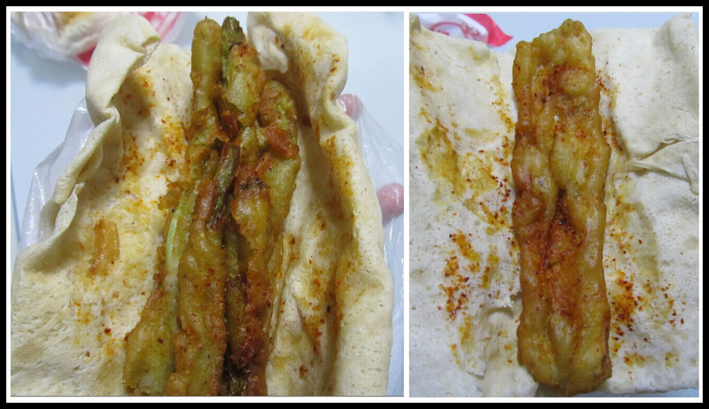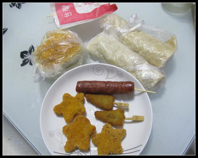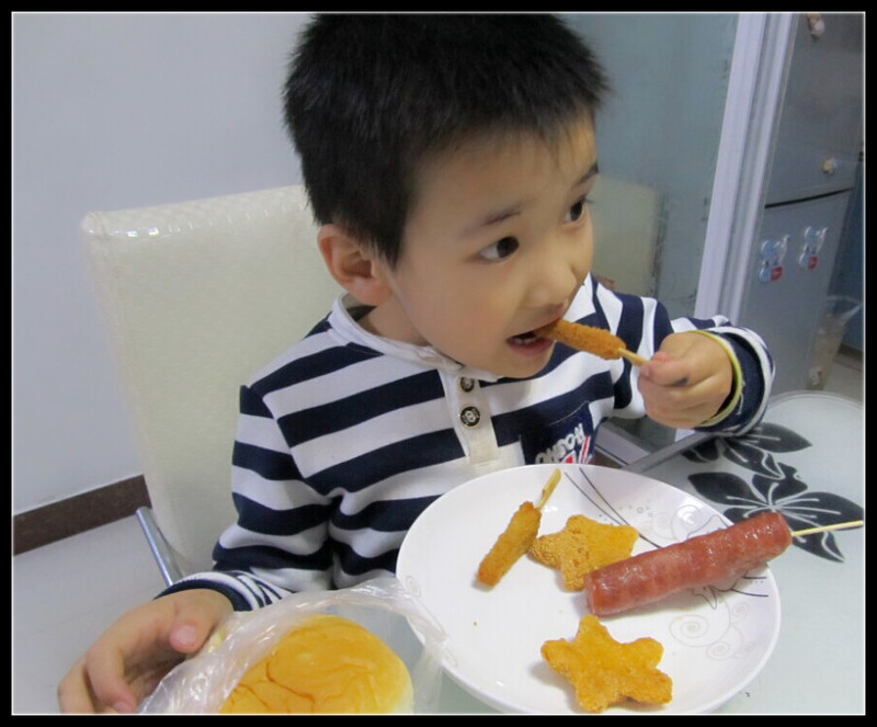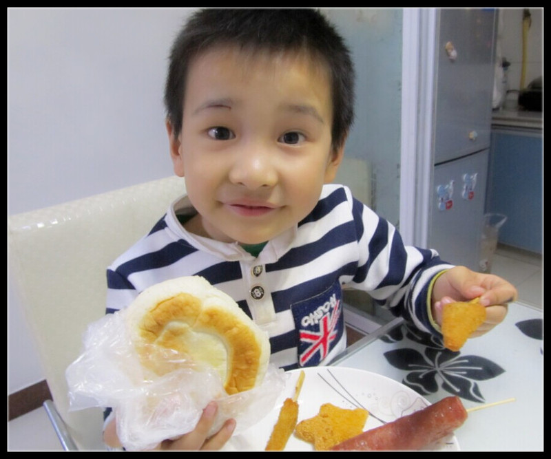 今天的晚餐要炖个大白菜吃,可是去练琴的路上Aric说想吃汉堡包了,我们都比较爱吃第一香的汉堡,价格实惠,而且好吃,不过Aric还很爱吃满天星和黄金鸡柳,因此不可避免的要买两份了。这样给Aric点了一个汉堡、一份黄金鸡柳、一份满天星,看到喜欢吃的东西了,Aric的心情也好了起来,边提着自己的美食边唱着“一闪一闪亮晶晶,满天都是小星星……”这可是为了那满天星而唱哦。 既然Aric都吃了最喜欢吃的汉堡,我也不想回家再吃家常菜了,于是在第一香的汉堡店里给自己卷了两个煎饼。虽然我是山东人,但是很少吃煎饼的,主要是咬不动,但是偶尔吃吃还是不错的,一个是卷了炸鸡肉串,另一个想吃鸡蛋来着,可是没有了,只好退而求其次,点了炸米豆,这个老公很爱吃的,但是最近他牙齿不好,也咬不动了,就很少见他吃了。我点这个的主要目的还是想馋馋老公呢,哈哈。