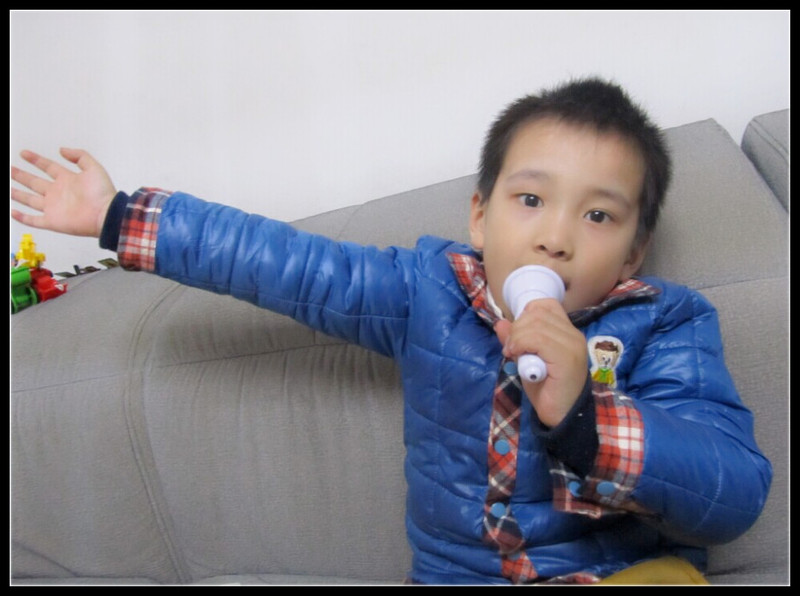 Aric感觉不尽兴,但是也没有办法。他们幼儿园最近把小苹果这首歌编了舞蹈,在课间操播放,Aric跳的特好。就喊着爸爸放小苹果,听第一遍的时候,Aric就开始跳了起来,不过因为我和老公都看着他,小家伙竟然腼腆起来,害羞了。小脸红通通的坐回了沙发,不过很快他又释怀了。这回人家可不跳舞了,开始唱起歌来。“你是我的小呀小苹果,怎么爱你都不嫌多,哄哄的小脸温暖我的心窝,点亮我生命的火,火火火火!” 哎呦喂,还别说,既没有唱错了歌词,也没有唱跑调,必须要点个赞啊,我和老公配合的鼓起掌来,Aric觉得很满意,顿时又将歌喉放开,大声的唱起了别的歌。我说咱唱个抒情点的吧,Aric问什么是抒情?我说就是把内心的感受唱出来,温和一点的歌。Aric想了半天也想不到,我说不如唱英文版的一闪一闪亮晶晶吧。记得最近有个广告很多次播放,就是英文版的这首歌很慢、很抒情的唱出来,我特喜欢,然后我和Aric就像唱情歌似得,唱了起来。 ![]() 看咱是不是特有歌手范儿呢?哎呀,下次得打扮的帅一点,这忒影响形象了。 ![]() 唱到了最激动的地方,虽说小家伙不认歌词,但是可以装的嘛,有的歌词不记得了,也不影响咱唱歌,反正调调对了就成了。