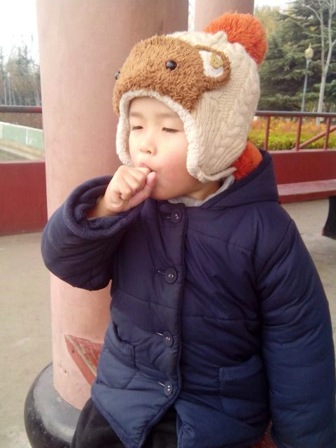 然后,我们又去人工湖旁边的环湖路散步,孩子要跟我赛跑,可是刚路几步不小心他就摔倒了,还好没摔痛,孩子也没有哭。我想继续和他一起散步,看风景,结果他不同意,说想吃棒棒糖,让我帮他打开,然后跟我说要去小亭子那里的小凳子上坐一会儿,好吧,那就去坐坐吧。小家伙坐在那里边看风景,边吃棒棒糖,先是问我:今天的湖水怎么这么干净?我一看,孩子观察还是很细的,湖面上确实很干净,不像上次来飘着很多垃圾,我说:“可能有环卫工人把垃圾清理了吧”,,过了一会儿,孩子又说:“妈妈,给我拍个照吧”,我倒是很意外,不过今天没有带相机,就用手机拍了几张,他吃棒棒糖的特写,我让他说:“茄子”他也很配合,看来主动要拍照的时候是最配合的了,以前我主动给他拍照,他很多时候都是不配合的。