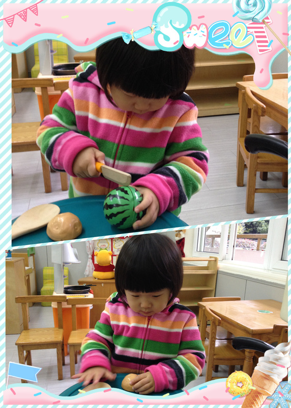 现在27个月的小妞已经不用妈妈时刻陪在身边了,她非常清楚自己爱玩什么,想玩什么,径直走到教室的“小小厨房”玩起了烹饪游戏。