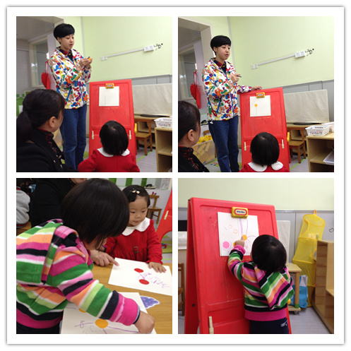 回到教室后,老师在展板上教孩子们画了纸贴画。圆圆的小贴片,添上简单的一笔。瞧,老师完成了气球!