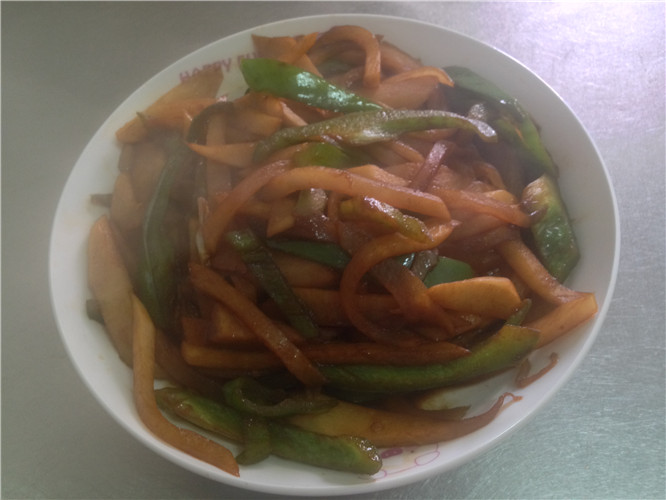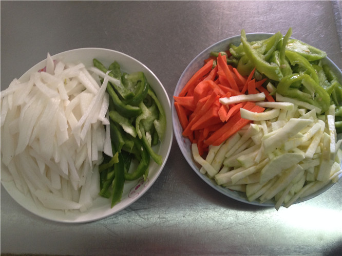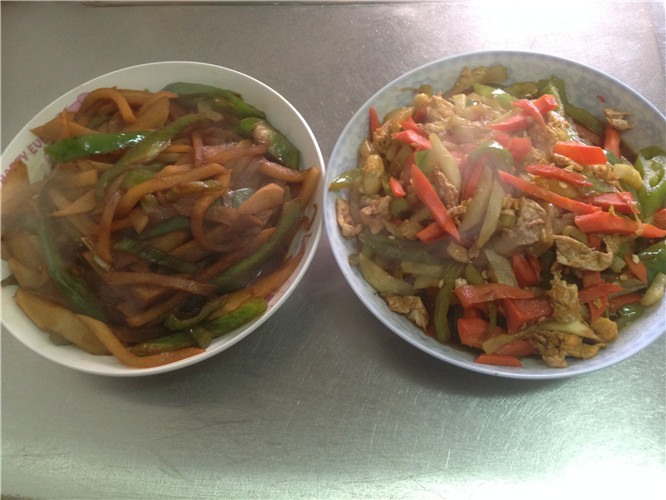 这还不算,等切完以后,再看,满满的两大盘子,而且这颜色搭配起来还瞒养眼的,看来有尖椒和青椒这菜还是蛮好搭配的!