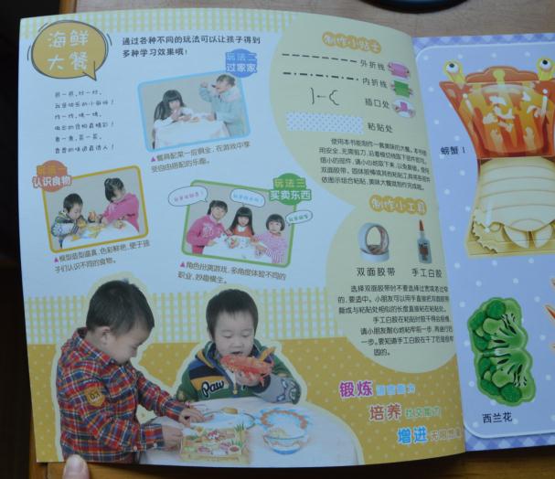 ![]() 这册书是参加论坛的活动获得的,发的很快哦,还没有看到站内信就已经收到图书了,这个手工书很适合大卫小朋友的胃口,所以那到手之后,小朋友就迫不及待的拿出来玩了,今天做什么呢,龙虾,大卫小朋友的最爱,于是在妈妈的帮助下,他的小龙虾完工了。可能对于吃货们来说,还有喜欢玩过家家游戏的小朋友们来说,这本书里面的一些画面本身就是十分吸引和诱惑人的哦。 ![]() 书页里面还有西兰花和一些水果条,配出来的菜式颜色很漂亮。大卫小朋友就扮演大厨,妈妈扮演大厨的助手,于是,我们家的烹饪开始了,正好也给大卫小朋友买了一些仿真的灶台和刀具餐具,于是我们就开动了。这本书里面的需要裁剪的地方都有处理好,只要小朋友稍微小心的扯一下,就可以轻松的把上面的纸片拿下来和书页分离,不需要使用剪刀去裁剪,对于大卫这样的小朋友来说,是比较方便和安全的。没有白胶,我们基本上都是用双面胶和透明胶固定的,效果也是蛮不错的,就是小朋友的手上粘了一些双面胶,洗手的时候还是费了一些力气才把他们都清理掉的。 ![]() 这本书的玩法很多,除了食材,还有有趣的食盒和餐具,小朋友可以根据自己的喜好搭配不同的食材,是小朋友们过家家不错的辅助。看来剩下的5本也要入手了,比较期待的是那本中国美食,不知道里面会有一些什么美食呢,从封面上看到了一个很大的火锅,希望是立体的呢。 ![]() 第二本是地带积分兑换的,看到书名,就觉得应该是一个比较美的故事,果然收到之后没有失望,不论是文字和书的绘画的风格都是很不错的,一本很值得买给孩子看的图书哦。 ![]() 这是一本适合在晚间亲子阅读时间里翻阅的一本有趣的绘本哦,对于这本书所描述的世界里,大卫小朋友也是有很多的疑问和期待的,这是世界,在小朋友们的脑海里又是什么样子的呢?