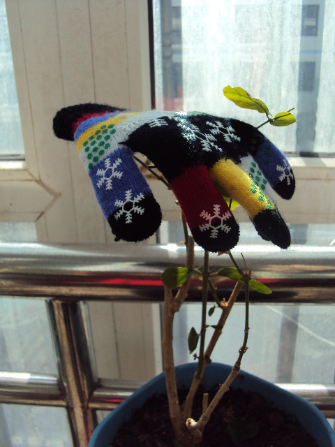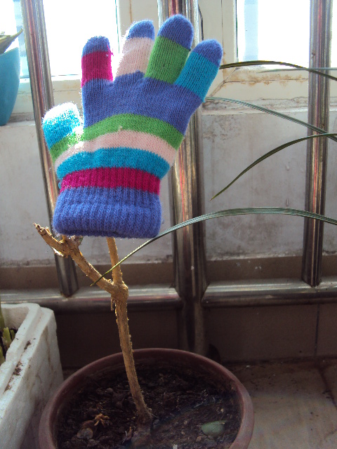 我们家的自动晾衣杆,孩子能够得到那摇上摇下的把手,可是人家根本不需要用晾衣杆,就地取材,阳台上的花花草草不是多嘛,有的还只剩下光光的枝子了,人家就把手套往那枝子上,树叶上一搭,真是晾晒的好地方呀!莫非他是看只有绿叶,没见着开花的太单调了?要用它的漂亮手套来装饰装饰? 突然感慨:没有想不到,只有做不到呀!宝宝这也是就地取材,合理利用资源啊! 今天下午,孩子跟着他姨睡的午觉,一觉醒来,跑到客厅里告诉我:“妈妈,我做了一个梦,梦到我的手套都干了!”我说:“是嘛,我来试一试!”我过去用手一摸发现还是湿的呢,我说:“没有干,梦都是反的呢!”
