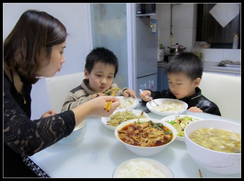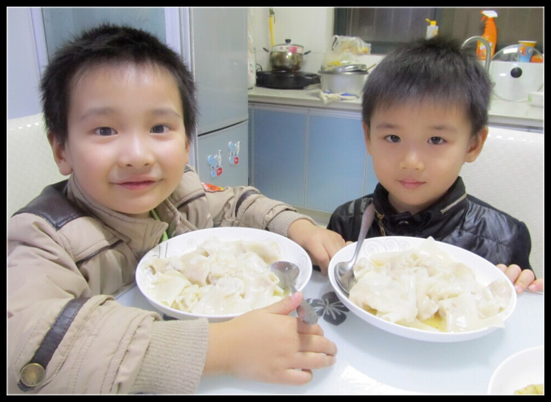 当闺蜜来的时候我还在厨房忙碌着,闺蜜把外套一脱就来给我帮忙,可惜啊,闺蜜是个不会做饭的女人,只会帮我刷刷碗、洗洗盘子,上个菜啥的。我这边两个灶,一个在炒菜,一个在煮给两个小盆友准备的馄饨,后面蒸锅在蒸着米饭,根本没有时间去客厅看看Aric和政宇。好在俩人玩的不亦乐乎,也比较少让我们操心。指挥着闺蜜上菜、盛汤,免费的苦力不用白不用嘛,哈哈,再说想吃就得干。 吃饭了,政宇又起幺蛾子了,我们都是母子坐在一起的,但是政宇死活不愿意和闺蜜坐在一起,就要和Aric坐在一起。最后无奈下,政宇坐在了最北面,闺蜜坐我旁边,而Aric夹在闺蜜母子俩中间。好家伙,合着我们两对母子都分开了。不过这样也好,我和闺蜜就可以毫无顾虑的吃水煮肉片了。这次两个小朋友都很棒,一人15个馄饨都吃得精光,看来小孩子还需要一起吃饭的,有个对比就吃得多、吃得快了。 ![]() 买回来的水煮肉片 ![]() 青椒炒豆腐,因为闺蜜爱吃辣,特地放了些红辣椒。 ![]() 炸米豆,裹了面粉,小朋友们比较爱吃。 ![]() 蘑菇鸡蛋肉丝汤,吃米饭没有汤会很干。 ![]() 给小朋友们煮的馄饨,听闺蜜说她家喜欢放点紫菜,可惜我家没有,回头买点备着。 ![]() 两个可爱的小帅哥,从小玩到大的好朋友呢,年龄差半岁,感情倍儿好!
