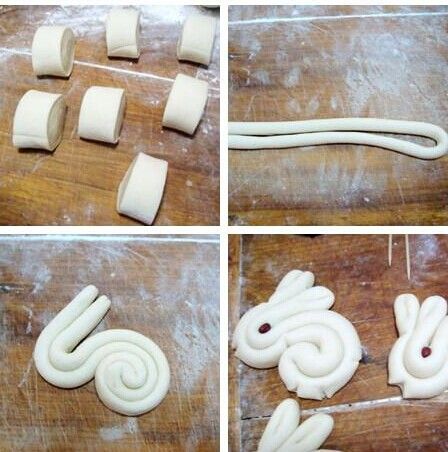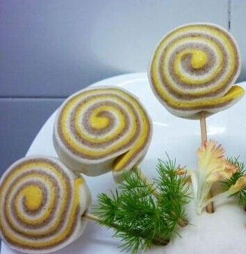 原料:面粉800克,奶粉50克,胡萝卜泥150克,豆沙100克,糖50克,酵母10克,发酵粉10克。 做法: 1.面粉分三份和胡萝卜泥,豆沙,水和成三色面团,醒发半小时,分别擀开成大小差不多的薄饼,叠加在一起,从一边卷起成筒状; 2.切开插入竹棒,醒发一会,入蒸笼蒸熟,就成了棒棒糖状的花卷了; 3.另外把面饼按扁,包入馅心,又变成了另外的一种花色面点; 玉兔馒头