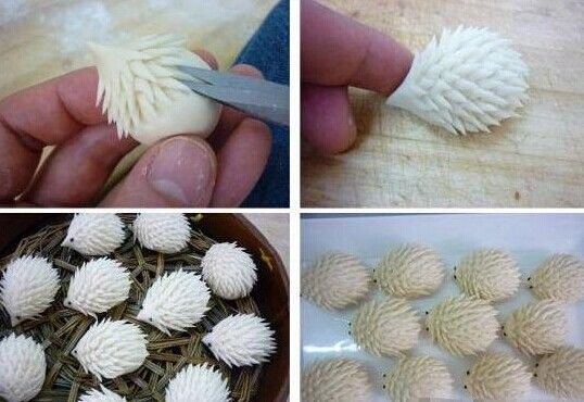 1、面粉中加入酵母、白糖和温水和成面团,饧15分钟。分割成每个50克的剂子; 2、搓成50公分的长条,对折起来; 3、从右边卷起,左边向上弯曲; 4、用两个牙签捏一下,把头和耳朵整出来,用小豆点上眼睛,剪出嘴和脚来; 5、放入蒸笼,大火烧开后20分钟即熟。焖3分钟出锅。 刺猬包
