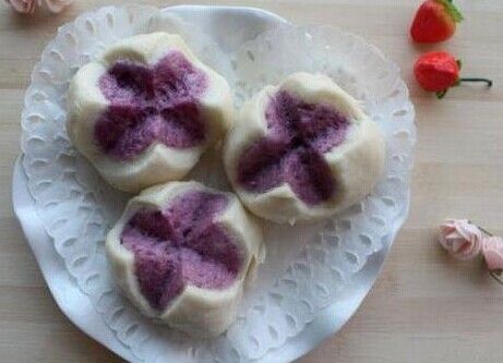 原料:面粉300g,紫薯2个,牛奶130g,白糖70g,奶粉10g,酵母4g。 做法: 1、红薯去皮洗净; 2、切块上锅蒸熟; 3、正好的紫薯用勺子压成泥; 4、将面粉,牛奶,白糖,奶粉和酵母混合均匀; 5、揉成光滑的面团,在温暖处发酵至2倍大; 6、取三分之一的白面团加紫薯泥揉成紫薯面团; 7、将剩下的白面团分成小剂子; 8、紫薯面团也分成小剂子; 9、取一白面团擀成圆形,放入揉圆的紫薯面团。 10、包好收口; 11、用刀子在其表面划十字; 12、做好的紫薯开花馒头; 13、将做好的馒头放入蒸锅,醒20分钟。大火蒸15分钟,关火后焖3分钟即可。 紫米玫瑰馒头