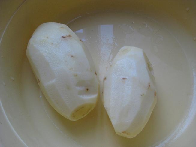 第一步,土豆洗净去皮,这个很简单,用削皮器就可以了。这一步算是最简单的了。所以你可以,如果你愿意自己做,就和我一起动手吧!