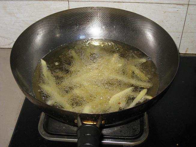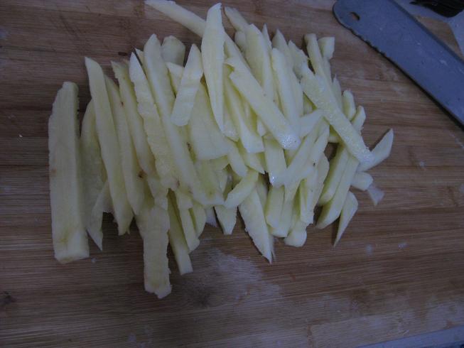 第二步,土豆切条,我切得不细,太细了不好吃,一炸就没有了。我以前也做过一次,切得太细,一炸就糊了。这个宽度你要自己把握了,和筷子差不多就可以了。