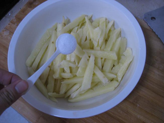 第三步,用食盐腌制10分钟,我没在放别的添加剂,因为孩子吃,越简单越好。我不喜欢在孩子的食物里添加太多的味道添加剂。 第四步,要把腌制好的薯条控水,这样子炸的时候就不会油花四溅了。 第五步,锅中放食用油,我选择花生油,因为这是我的最爱。