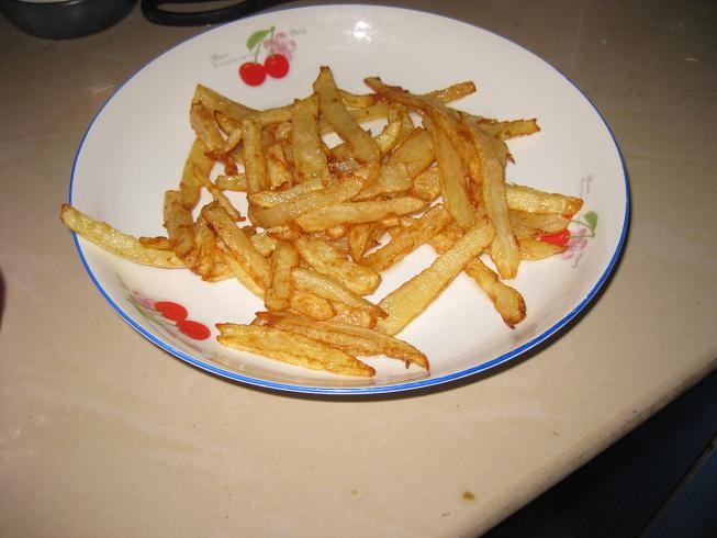这个我们也偶尔做,我在网上搜到的食谱,是切好的薯条用盐水浸泡后再冷冻,然后拿出来炸,也不错,下次试试亲的这个方法。