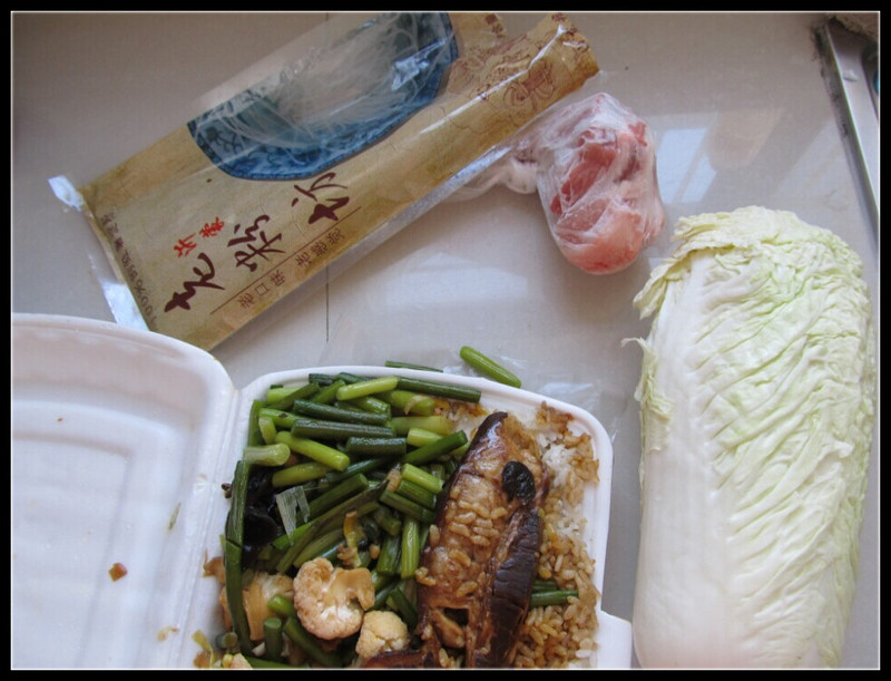 Aric和老爸老妈去了弟弟家,老公出去工作,今天的午餐只有我一个人吃。打电话订了个盒饭,要的是红烧肉的,可是收到以后却发现一点儿食欲都没有。那肉肥的令人作呕,那蒜薹的蒜味令我反胃,忍着胸口的郁闷吃了一口,赶紧吐了出来,这是个什么样的生活啊,太可悲了,还不如我自己做饭吃呢。想到自己做的家常菜虽说不是非常好吃,但我估计,也胜过盒饭了吧,于是开始动手。 家里还有一颗大白菜,又从冰箱里取出一块冻肉,泡上了粉条,切好了白菜以及肉,就做个大白菜炖粉条肉吧,简单还好吃。趁着做饭的时候,又蒸上了米饭,盒饭我是一点儿也不愿意碰了。先把肉给炒喽,放点味达美稍微一顿,好歹是卖给Aric的五花肉,做起来也会香一些,没办法,今天就特别想吃红烧肉,不过我不太会做,只能从大白菜炖肉中来稍微的做出那么一点儿红烧肉的味道。