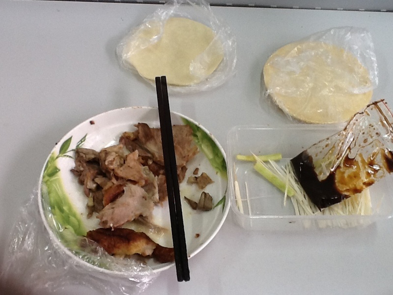 然后我给婆婆也卷了一个烤鸭卷,很香的烤鸭卷。最后我也吃了一些,北京烤鸭名不虚传啊,尤其是酱料比我们这边做的好吃,我们这边的酱料偏咸,而这个酱料味道有点甜甜的,放在烤鸭里面吃真的很好吃哦,以后有机会去北京也要尝尝热乎乎的烤鸭。