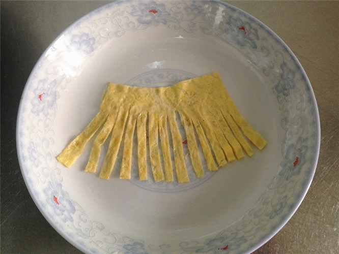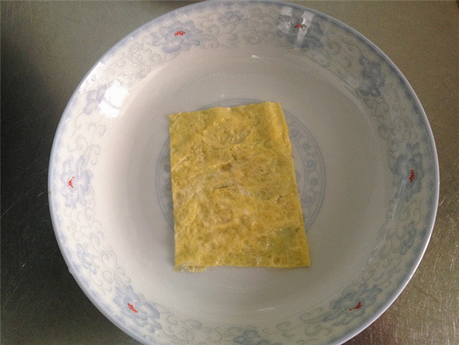 这第二步对我来说是最难的了,就是要摊薄薄的鸡蛋饼,这个鸡蛋饼要求特别的薄,比豆腐皮还要薄,就跟一张薄纸一样,第一次做,还好做第二张的时候找到感觉了,总算成功,因为考虑大病初愈的人还是以清淡为主,所以这个鸡蛋饼不要放太多的油,就是少许就可以了,这样不会油腻!把摊好的鸡蛋饼切去边角,做成长方形,别说经过这么已加工,我的第一张长方形博饼竟然成功了,还看的过去吧!
