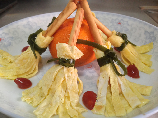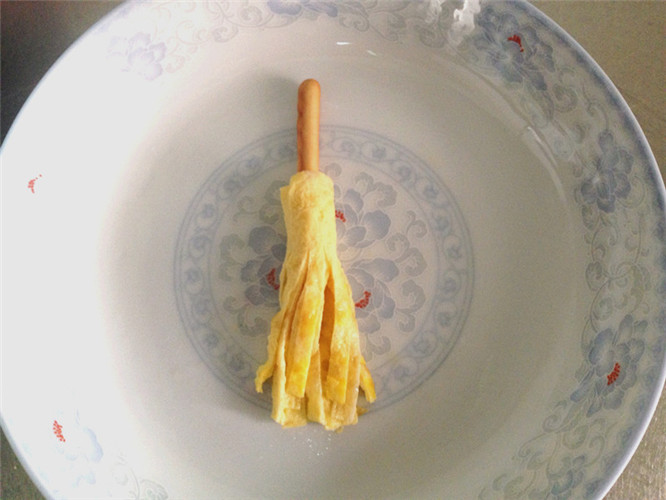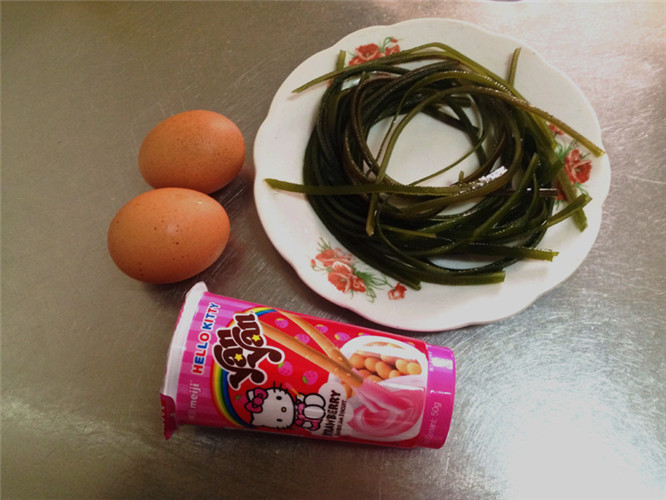 刚刚恢复,胃口也不是太好,爱吃的炒饼也吃不了几口,海鲜味的鸡蛋糕蒸了一大碗也没吃,总之胃口不好,什么都不想吃啊,这个可以理解,可是啥都不吃也是个头疼的事儿,于是俺又开始挖空心思琢磨给孩子做点儿花样,想想平时的不爱吃,做个新花样看看能否打通孩子的胃 !关键这个可以吃进去一部分鸡蛋,这才是我的目的! 俺向来都只会做简单的一些美食,学也只会学一些简单的,这个扫把已经心仪已久,只是一直没有时间来做,这回趁着小家伙儿恢复体力的时候,俺也贡献一把! 这个扫把可以说做起来超级简单,材料就这几个:鸡蛋、海带丝、酱饼干条、淀粉、番茄酱!