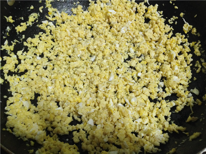 锅里放油,小火,磕五六个鸡蛋放锅里,撒点盐,用筷子朝着一个方向不停的搅拌,主要把鸡蛋打碎,越碎越好!