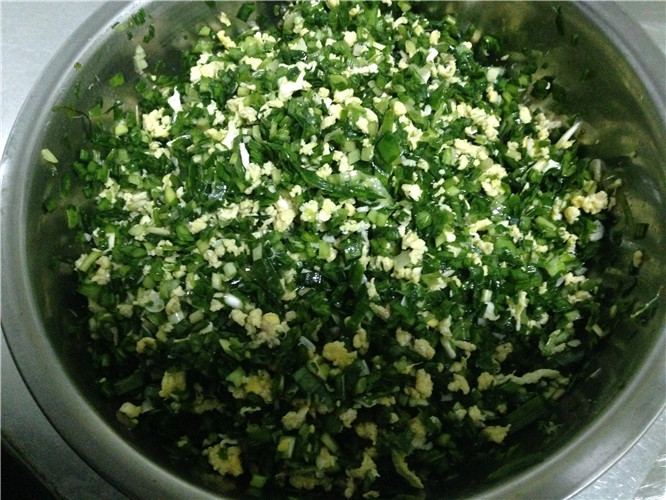料儿都准备齐全了,现在开始调馅子,把虾米鸡蛋统统倒进韭菜里,把菜馅子调拌均匀!