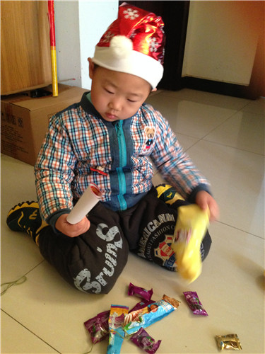 第一个口袋终于被打开了,哇,一堆糖果啊,此时昊昊竟然说了一句:“圣诞老人万岁”,着实让我惊讶,这小家伙实在太兴奋了!