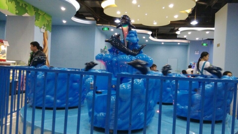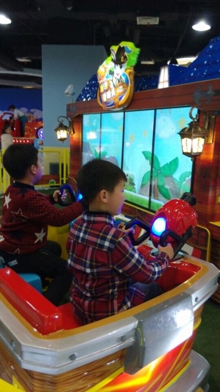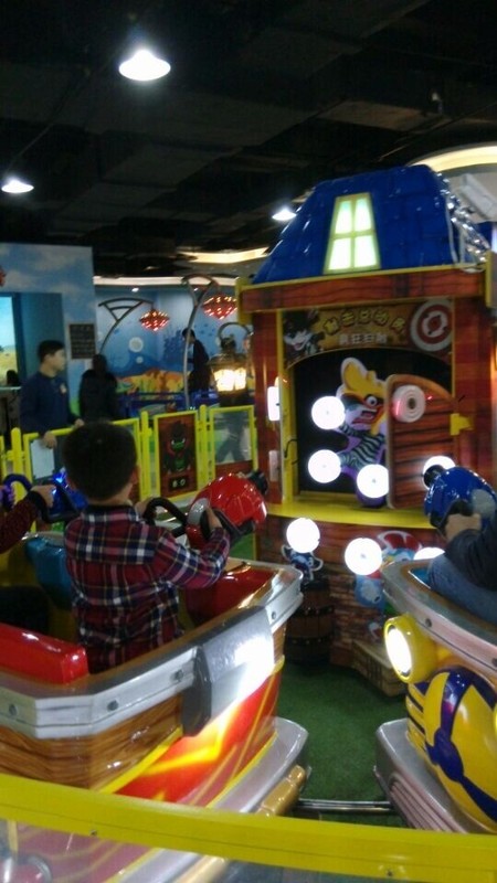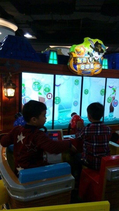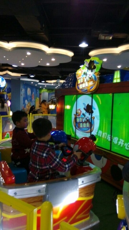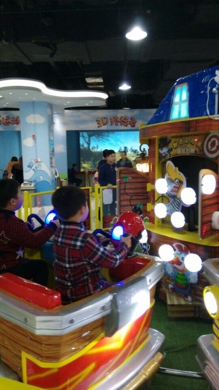 接着点点看见了旋转的海豚,两个孩子也想要坐,可是这个海豚坐上去也没有什么意思,他们就等着玩"射击总动员",这个射击感觉没有实际的感觉,点点和小奇两人都没有玩到什么,就坐在位置上直接射击,并没有很好玩的东西,要射击中目标也不是很容易,点点射中的还没有小奇的多,这样两人玩过一关就进入下一关,没有回头路可以走的。这个射击的游戏要是有体感的话,会更加有意思。