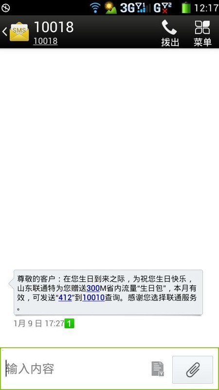 在1月9号的下午,突然收到了联通发来的短信,说为了祝我生日,联通特地赠送300m省内流量生日包。当时觉得特别惊讶,还有些不相信,但是第二天接着收到了每天都会发送的用流量多少的短信,果然有加了300m的流量呢。哈哈,这个月不怕超流量了,哪怕在外面也可以随时随地的看小说或者上网玩。不过1月1是我的生日,如果这短信提早10天发来,会更好,当然了,我也很知足。 同时我又在想,联通怎么知道我的生日。老公提醒我,当时去办理宽带和联通号的时候,不是有留的身份证复印件嘛,估计被系统记录了下来,所以才有了这赠送的事情发生。以前没试过联通给的任何祝福消息,也早是老会员了,突然这样一来惊喜,很开心啊。我想无论是谁,在生日的当月收到关于祝福的短信和赠送的哪怕是微不足道的小礼品,都会一样的惊喜,而又很开心。