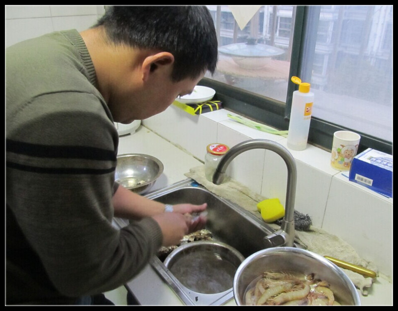 前几天老公去青岛出差,临走时我交代他回来时带点海鲜回来。其实我们本地也有,但是不是很新鲜,而河里的动物倒是特别多,却毕竟不如海生物要好吃。终于等到了老公回来,还真买了不少,其中有对虾、海虾、海蛎子、鲅鱼,其中鲅鱼我们也经常吃,不过老公去出差的时候吃了一次烧烤,说青岛的鲅鱼更好吃一些,所以买回来让我做做尝尝区别大不大,另外送给老妈一些。 海虾我不知道是不是说多了,记得老公说的是三个字,但是这要比对虾要大,煮完以后剥皮的感觉很硬,但是肉质很鲜美,味道非常不错。海蛎子我不爱吃,上次去青岛的时候就点了海蛎子,吃几个还好,吃多了有些腻。当天我们就做了海蛎子和海虾,其中老公一直忙活着用牙刷来刷海蛎子。满水池的泥巴,这海蛎子我当时还挺好奇是怎么吃的,也没看到有开口的地方啊。